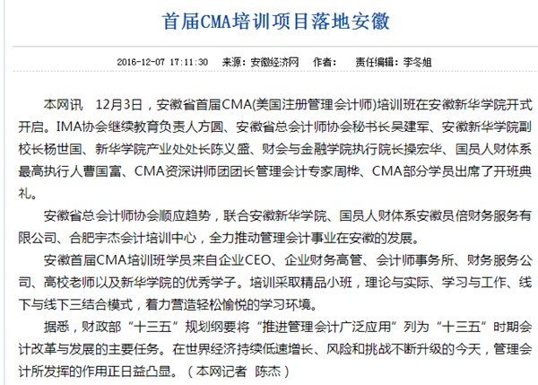 万家热线:安徽省首届CMA培训班开班 培养应用型高级财务管理人才
