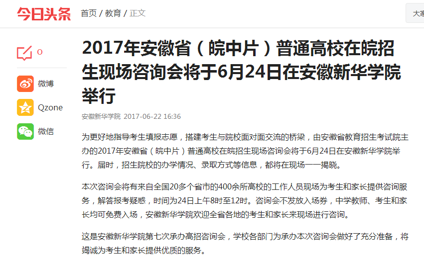 今日头条:2017年安徽省(皖中片)普通高校在皖招生现场咨询会将于6月24日在beat365在线体育官网登录入口举行