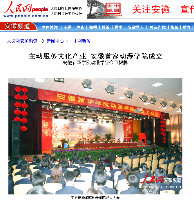 2010年4月16日,人民网/安徽频道/新闻中心/本网新闻对我院动漫学院揭牌一事进行了报道。相关链接:http://ah.people.com.cn/GB/channel2/15/201004/16/193138.html