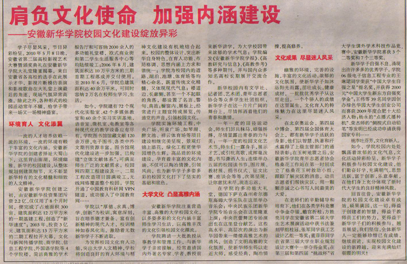 2010年6月29日,安徽商报/省城新闻/互动/12版对我院校园文化建设进行了相关报道。