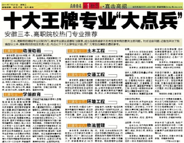 7月27日的江淮晨报B04版文章《十大王牌专业“大点兵”》列出以下三本和高职院校十大王牌专业介绍,供广大考生在填报志愿时参考。beat365网登动漫动画、土木工程、环境工程、物流管理、电子信息工程专业入选推荐高校名单。