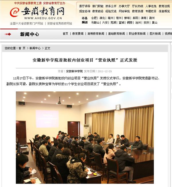 安徽教育网首页报道beat365网登校内创业项目“营业执照”正式发授