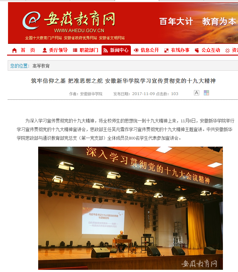 安徽教育网:筑牢信仰之基 把准思想之舵 beat365在线体育官网登录入口学习宣传贯彻党的十九大精神