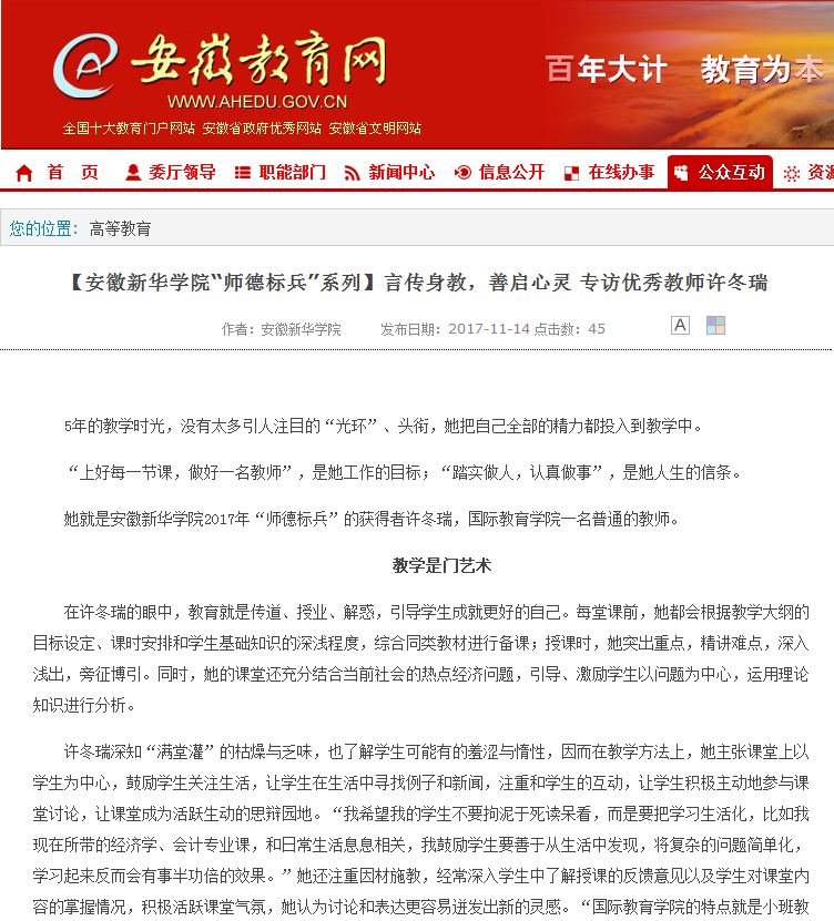 安徽教育网:【beat365在线体育官网登录入口“师德标兵”系列】言传身教,善启心灵 专访优秀教师许冬