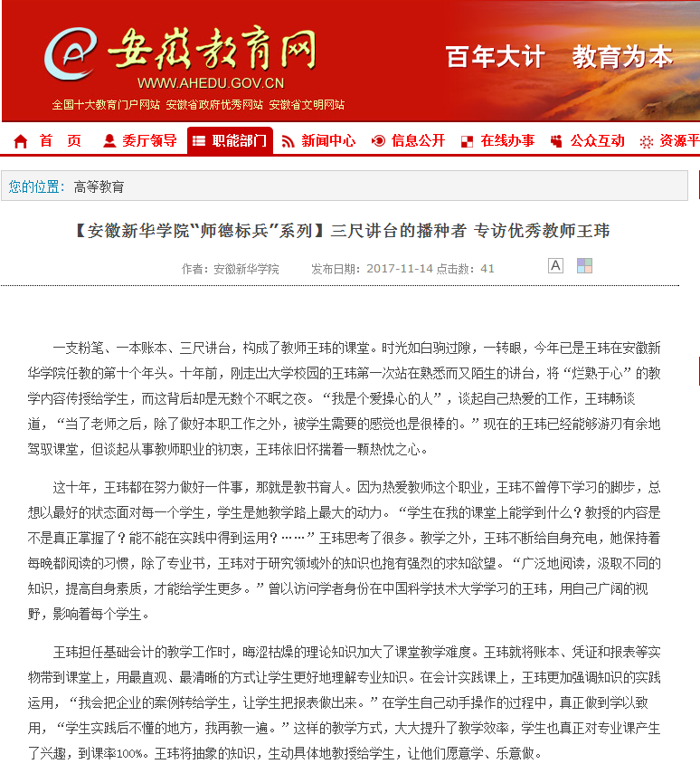 安徽教育网:【beat365在线体育官网登录入口“师德标兵”系列】三尺讲台的播种者 专访优秀教师王玮