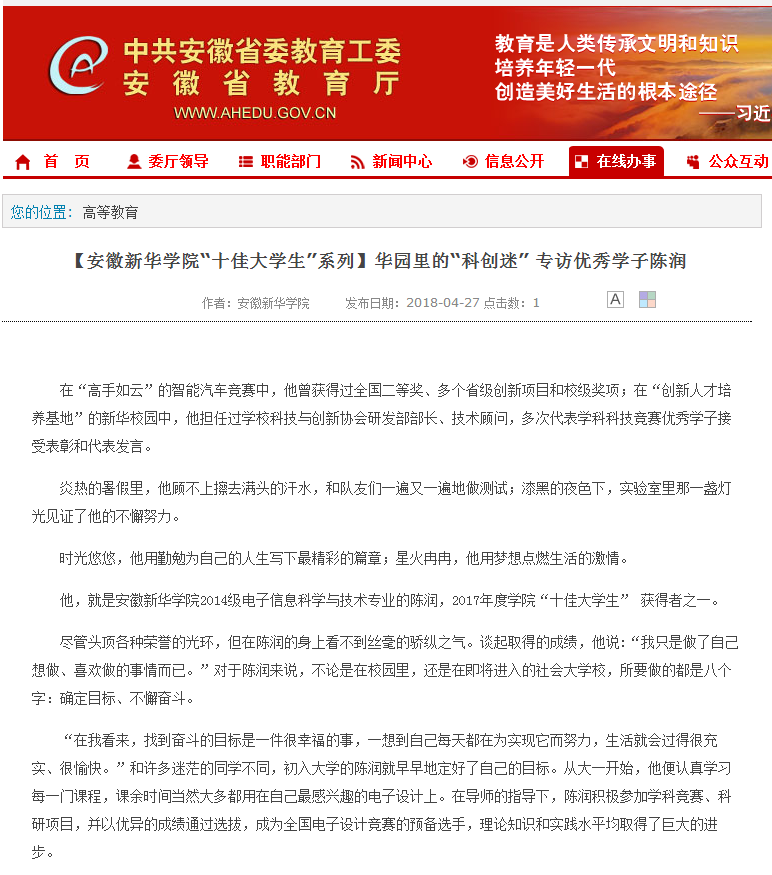 安徽教育网:【beat365在线体育官网登录入口“十佳大学生”系列】华园里的“科创迷” 专访优秀学子陈润