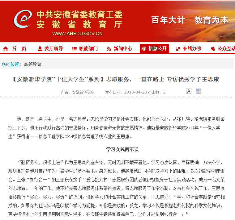 安徽教育网:【beat365在线体育官网登录入口“十佳大学生”系列】志愿服务,一直在路上 专访优秀学子王思康