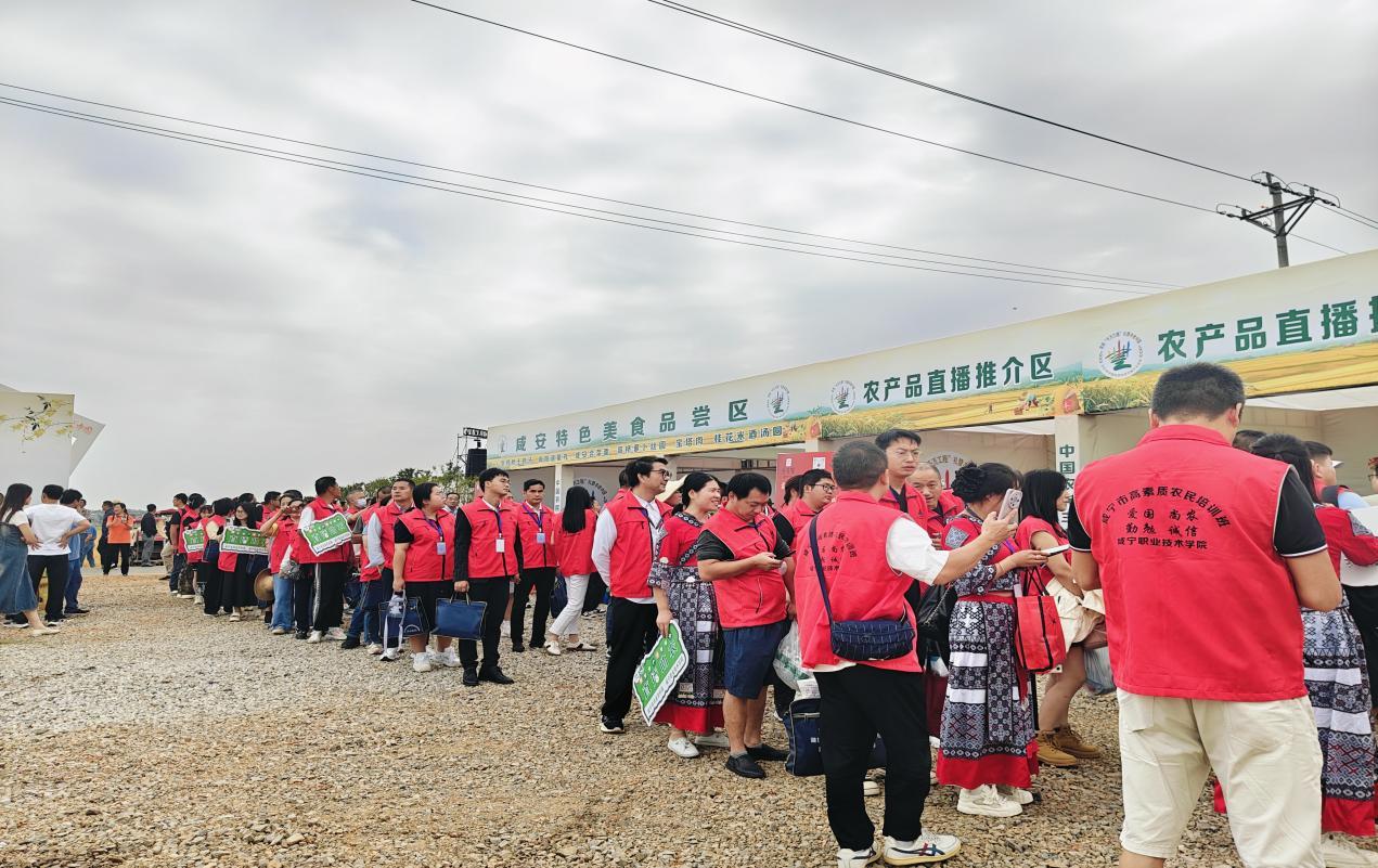 “紫薯粉丝美味又健康,富含花青素等营养成分,可以下火锅,也可以煮着吃,吃法多样……”在“稻海”农贸市集展位前,学员们分成8个小组,摆好支架,拿起手机,拍视频,开直播,与网友们积极互动。通过现场试吃、幽默解说等方式,全方位介绍紫薯粉丝的口感、品质、价格等,引来了不少网友观看订购。